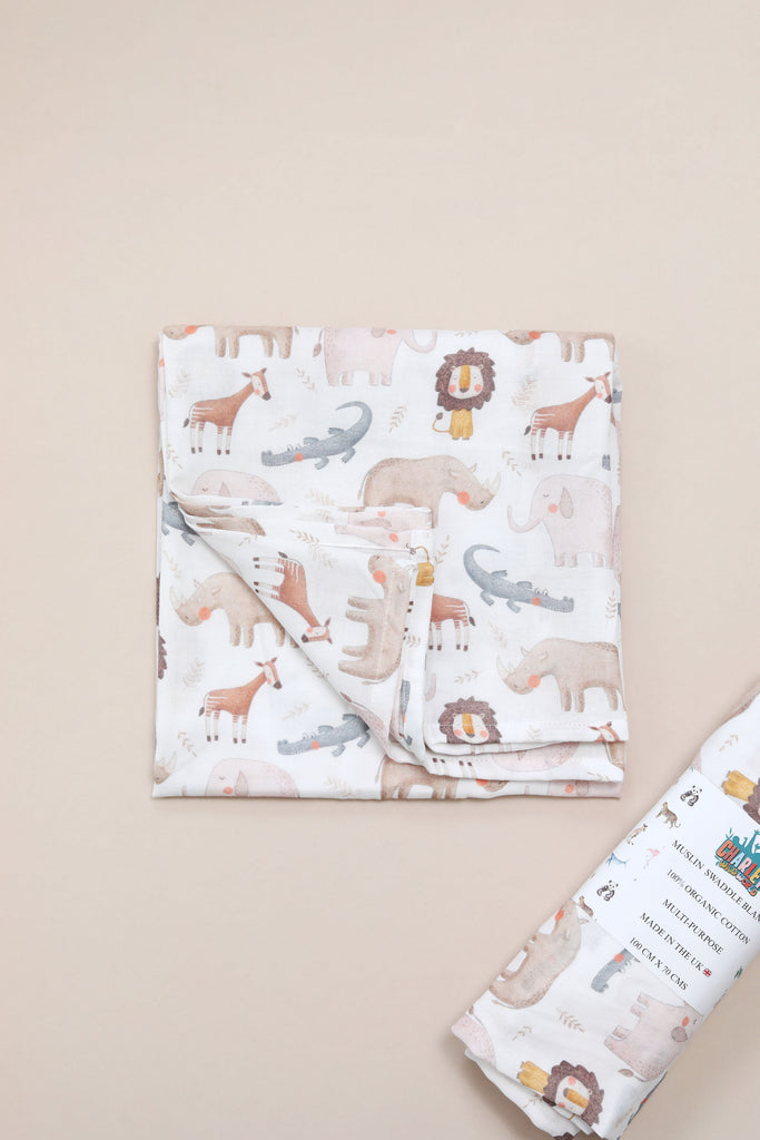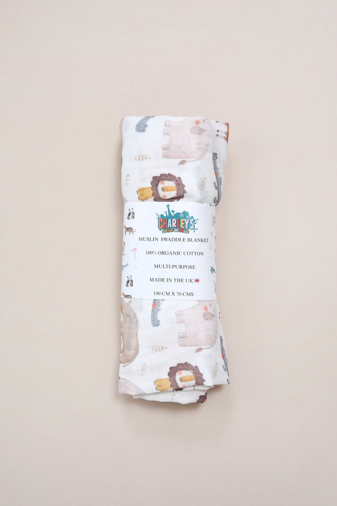 Featuring our adorable zoo lane print, it’s ideal for adding a touch of wild charm to nap time, pram strolls, or cosy cuddles at home. Measuring 100cm x 70cm, it’s the perfect size for use as a blanket, swaddle, comforter, or even a handy breastfeeding cover.