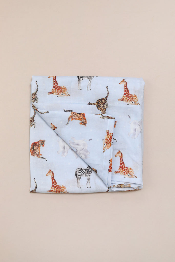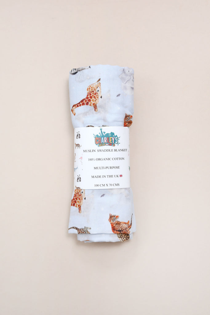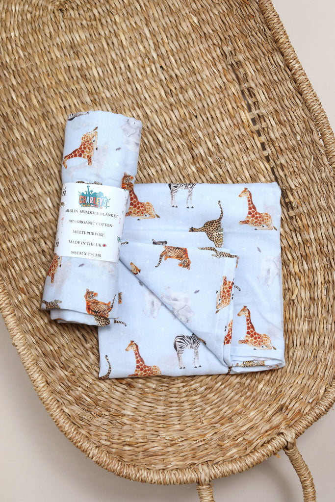 Featuring our adorable blue safari print, it’s ideal for adding a touch of wild charm to nap time, pram strolls, or cosy cuddles at home. Measuring 100cm x 70cm, it’s the perfect size for use as a blanket, swaddle, comforter, or even a handy breastfeeding cover.
