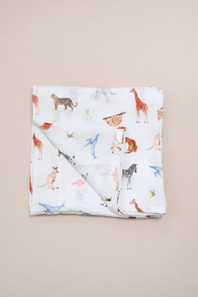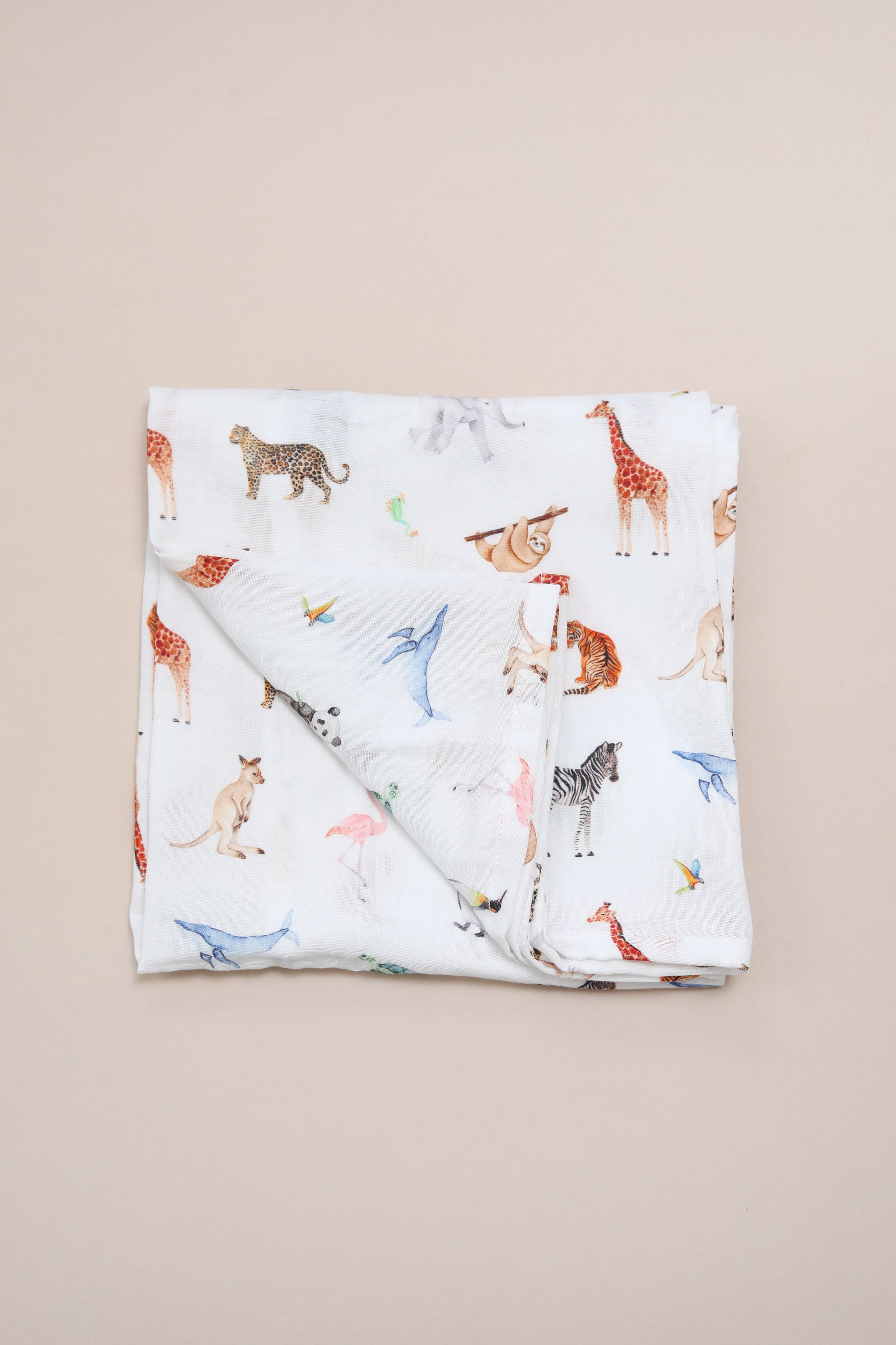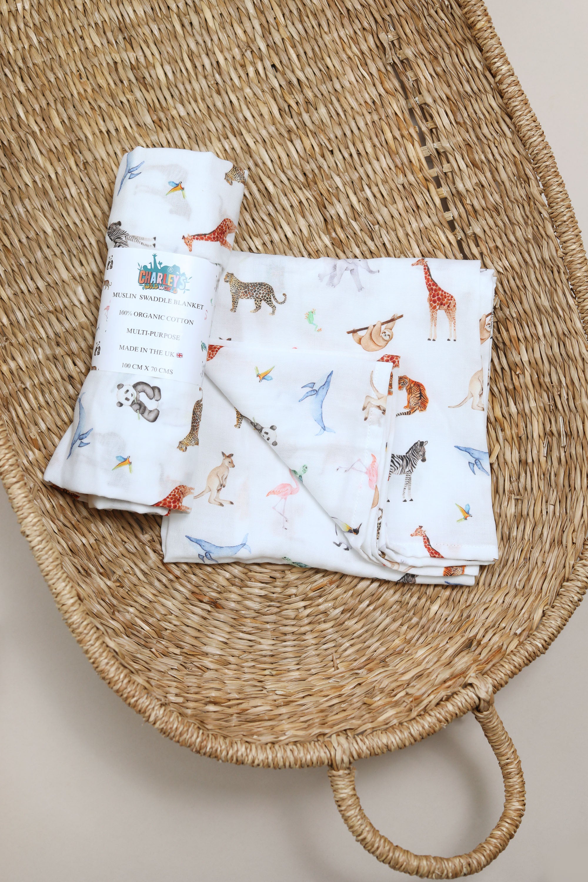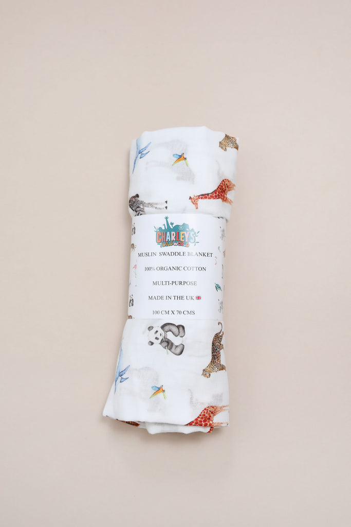 Featuring our adorable wild world print, it’s ideal for adding a touch of wild charm to nap time, pram strolls, or cosy cuddles at home. Measuring 100cm x 70cm, it’s the perfect size for use as a blanket, swaddle, comforter, or even a handy breastfeeding cover.